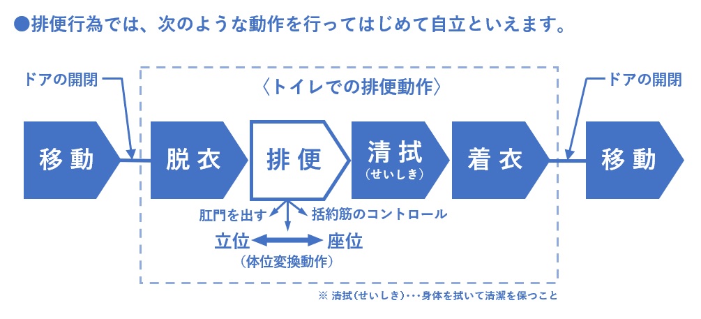 着衣や脱衣を行う場所(立位で、便器に座って、車椅子上の場合など)も考慮します。
