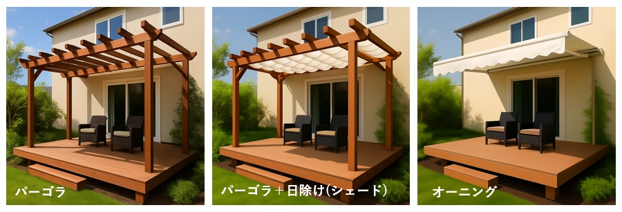 休憩スペースや作業スペースの上に、藤棚のようなパーゴラや、開閉式のオーニング(日よけ幕)を設置します。夏の強い日差しを避け、熱中症のリスクを減らしながら快適に庭で過ごす時間が増えます。軽い雨なら作業を続けることも可能です。